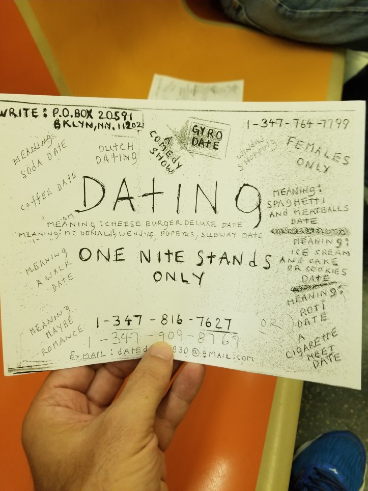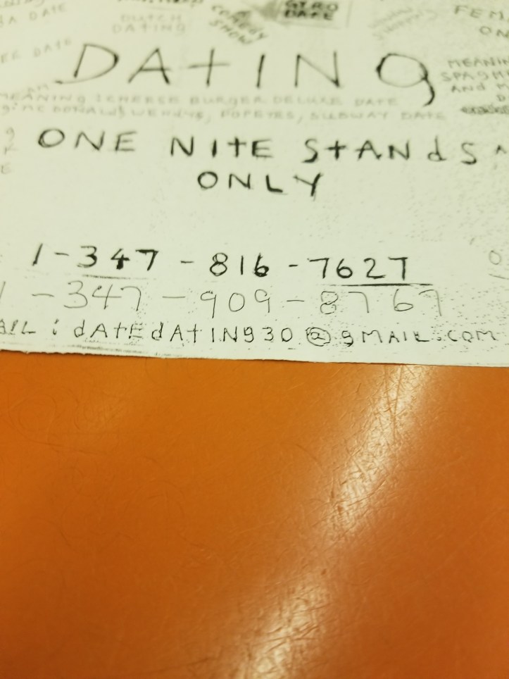 July 28, 2019July 28, 2019 MacGregor Rucker Old school dating app? Guy came through and papered the entire train car with these. Certainly a novel approach to an age-old problem. Share this: Click to share on X (Opens in new window) X Click to share on Facebook (Opens in new window) Facebook Like Loading... Related