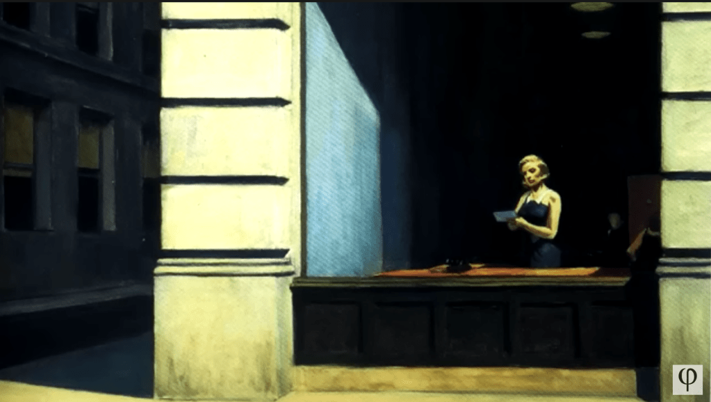 ↓ PAINTINGS ↓ / (timestamps + info) 00.00 nighthawks, 1942 04.28 lighthouse hill, 1927 08.35 morning sun, 1952 11.46 summer evening, 1947 15.15 office in a small city, 1952 18.54 sun in an empty room, 1963 22.48 new york office, 1962 26.56 chair car, 1965 30.31 rooms by the sea, 1951 34.39 new york movie, 1939 39.12 the sheridan theatre, 1937 43.24 cape cod morning, 1950 48.00 hotel lobby, 1943